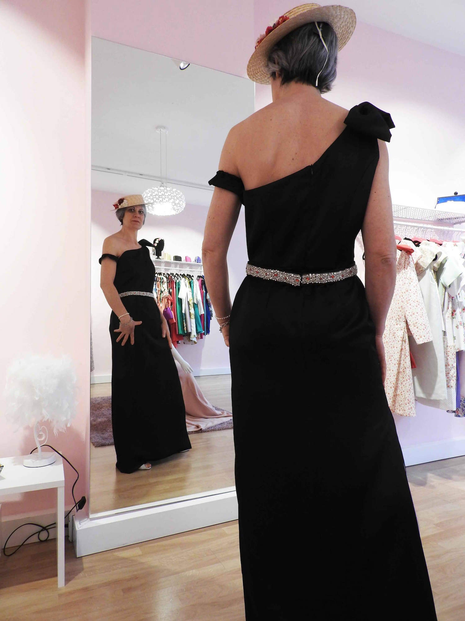El cinturón en pedrería, y abertura lateral en la falda.